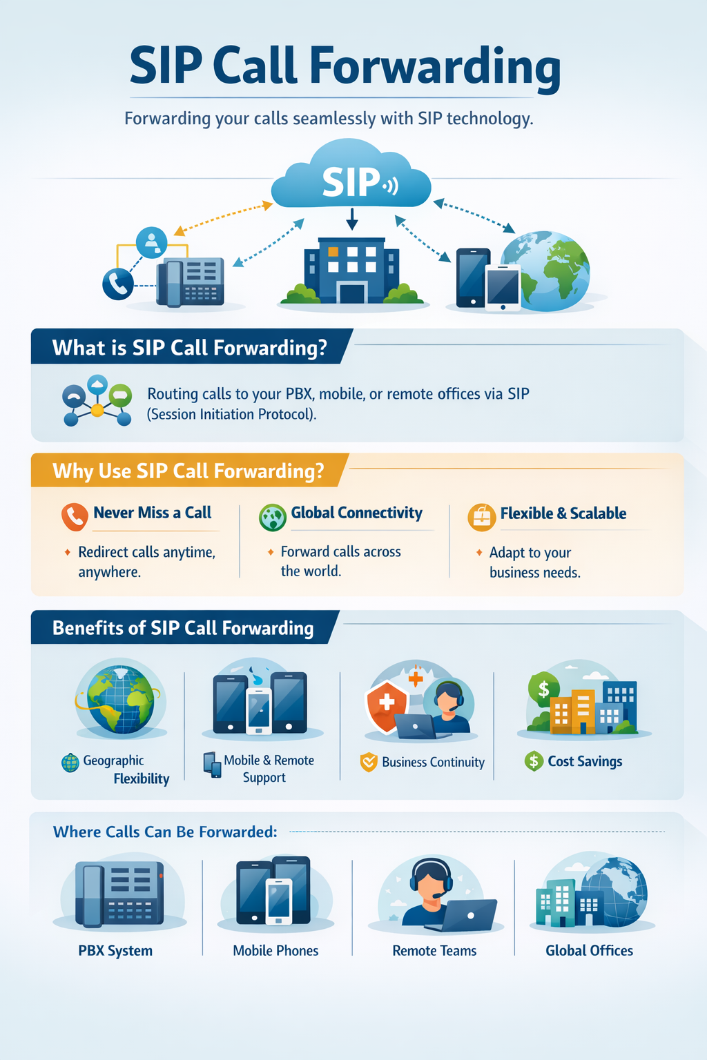 SIP call forwarding — including forwarding calls to your PBX via SIP — is no longer an optional feature. It’s a foundational part of modern business voice strategies. With global teams, remote workers, and customer expectations for instant connectivity, SIP gives you: